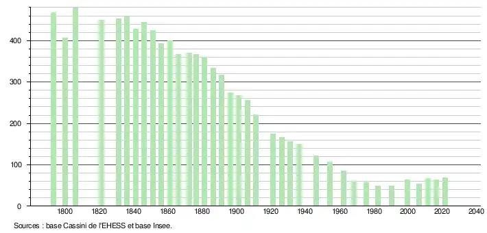 L'évolution du nombre d'habitants est connue à travers les recensements de la population effectués dans la commune depuis 1793. Pour les communes de moins de 10 000 habitants, une enquête de recensement portant sur toute la population est réalisée tous les cinq ans, les populations légales des années intermédiaires étant quant à elles estimées par interpolation ou extrapolation[20]. Pour la commune, le premier recensement exhaustif entrant dans le cadre du nouveau dispositif a été réalisé en 2006[21].