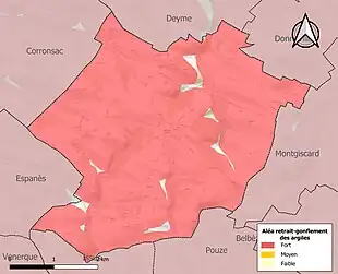 Le retrait-gonflement des sols argileux est susceptible d'engendrer des dommages importants aux bâtiments en cas d’alternance de périodes de sécheresse et de pluie. 98 % de la superficie communale est en aléa moyen ou fort (88,8 % au niveau départemental et 48,5 % au niveau national). Sur les 252 bâtiments dénombrés sur la commune en 2019, 252 sont en aléa moyen ou fort, soit 100 %, à comparer aux 98 % au niveau départemental et 54 % au niveau national. Une cartographie de l'exposition du territoire national au retrait gonflement des sols argileux est disponible sur le site du BRGM[25],[Carte 3].