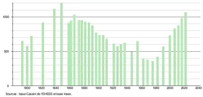 L'évolution du nombre d'habitants est connue à travers les recensements de la population effectués dans la commune depuis 1793. Pour les communes de moins de 10 000 habitants, une enquête de recensement portant sur toute la population est réalisée tous les cinq ans, les populations légales des années intermédiaires étant quant à elles estimées par interpolation ou extrapolation[25]. Pour la commune, le premier recensement exhaustif entrant dans le cadre du nouveau dispositif a été réalisé en 2006[26].