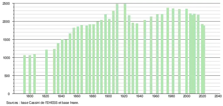 L'évolution du nombre d'habitants est connue à travers les recensements de la population effectués dans la commune depuis 1793. Pour les communes de moins de 10 000 habitants, une enquête de recensement portant sur toute la population est réalisée tous les cinq ans, les populations légales des années intermédiaires étant quant à elles estimées par interpolation ou extrapolation[20]. Pour la commune, le premier recensement exhaustif entrant dans le cadre du nouveau dispositif a été réalisé en 2004[21].