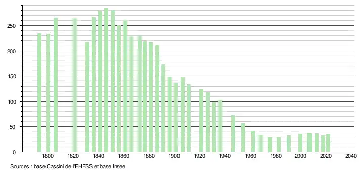 L'évolution du nombre d'habitants est connue à travers les recensements de la population effectués dans la commune depuis 1793. Pour les communes de moins de 10 000 habitants, une enquête de recensement portant sur toute la population est réalisée tous les cinq ans, les populations légales des années intermédiaires étant quant à elles estimées par interpolation ou extrapolation[14]. Pour la commune, le premier recensement exhaustif entrant dans le cadre du nouveau dispositif a été réalisé en 2007[15].