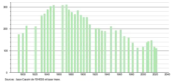 L'évolution du nombre d'habitants est connue à travers les recensements de la population effectués dans la commune depuis 1793. Pour les communes de moins de 10 000 habitants, une enquête de recensement portant sur toute la population est réalisée tous les cinq ans, les populations légales des années intermédiaires étant quant à elles estimées par interpolation ou extrapolation[17]. Pour la commune, le premier recensement exhaustif entrant dans le cadre du nouveau dispositif a été réalisé en 2008[18].