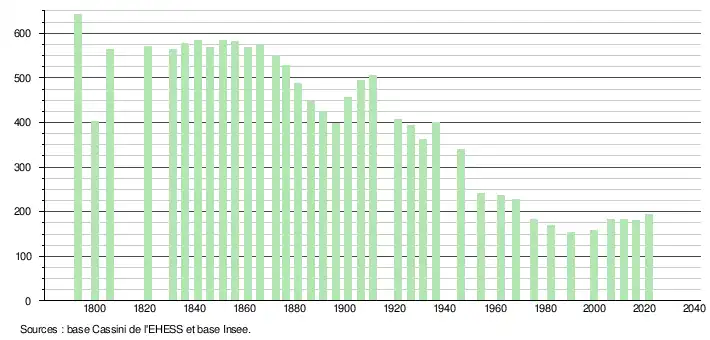 L'évolution du nombre d'habitants est connue à travers les recensements de la population effectués dans la commune depuis 1793. Pour les communes de moins de 10 000 habitants, une enquête de recensement portant sur toute la population est réalisée tous les cinq ans, les populations légales des années intermédiaires étant quant à elles estimées par interpolation ou extrapolation[17]. Pour la commune, le premier recensement exhaustif entrant dans le cadre du nouveau dispositif a été réalisé en 2006[18].