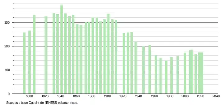 L'évolution du nombre d'habitants est connue à travers les recensements de la population effectués dans la commune depuis 1793. Pour les communes de moins de 10 000 habitants, une enquête de recensement portant sur toute la population est réalisée tous les cinq ans, les populations légales des années intermédiaires étant quant à elles estimées par interpolation ou extrapolation[22]. Pour la commune, le premier recensement exhaustif entrant dans le cadre du nouveau dispositif a été réalisé en 2008[23].