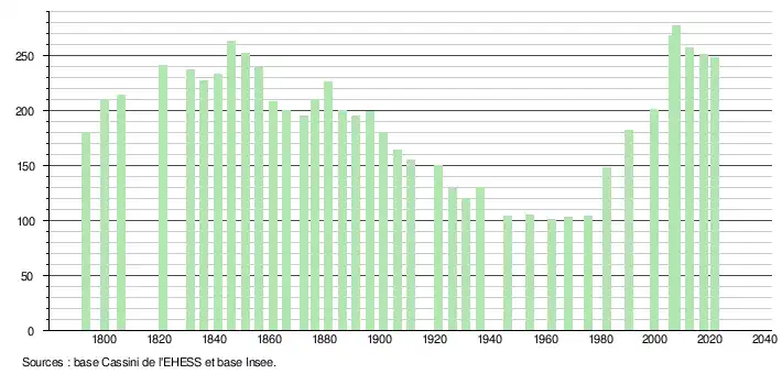 L'évolution du nombre d'habitants est connue à travers les recensements de la population effectués dans la commune depuis 1793. Pour les communes de moins de 10 000 habitants, une enquête de recensement portant sur toute la population est réalisée tous les cinq ans, les populations légales des années intermédiaires étant quant à elles estimées par interpolation ou extrapolation[18]. Pour la commune, le premier recensement exhaustif entrant dans le cadre du nouveau dispositif a été réalisé en 2007[19].