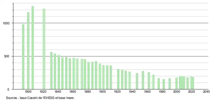 L'évolution du nombre d'habitants est connue à travers les recensements de la population effectués dans la commune depuis 1793. Pour les communes de moins de 10 000 habitants, une enquête de recensement portant sur toute la population est réalisée tous les cinq ans, les populations légales des années intermédiaires étant quant à elles estimées par interpolation ou extrapolation[23]. Pour la commune, le premier recensement exhaustif entrant dans le cadre du nouveau dispositif a été réalisé en 2004[24].