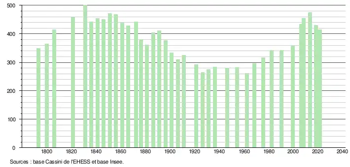 L'évolution du nombre d'habitants est connue à travers les recensements de la population effectués dans la commune depuis 1793. Pour les communes de moins de 10 000 habitants, une enquête de recensement portant sur toute la population est réalisée tous les cinq ans, les populations légales des années intermédiaires étant quant à elles estimées par interpolation ou extrapolation[31]. Pour la commune, le premier recensement exhaustif entrant dans le cadre du nouveau dispositif a été réalisé en 2008[32].