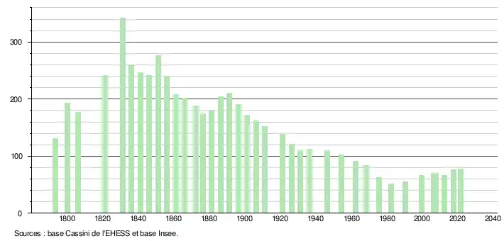 L'évolution du nombre d'habitants est connue à travers les recensements de la population effectués dans la commune depuis 1793. Pour les communes de moins de 10 000 habitants, une enquête de recensement portant sur toute la population est réalisée tous les cinq ans, les populations légales des années intermédiaires étant quant à elles estimées par interpolation ou extrapolation[43]. Pour la commune, le premier recensement exhaustif entrant dans le cadre du nouveau dispositif a été réalisé en 2007[44].