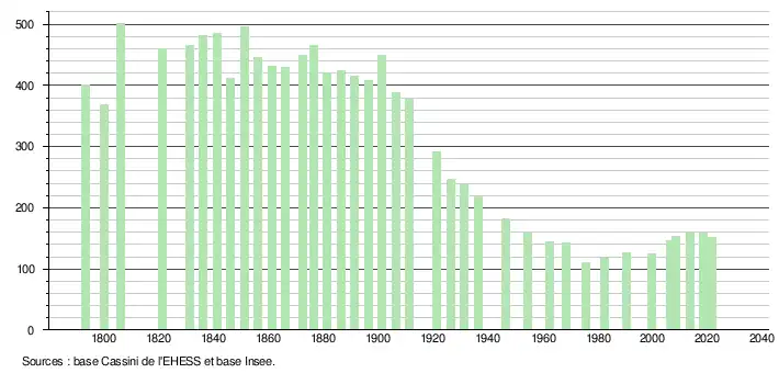 | L'évolution du nombre d'habitants est connue à travers les recensements de la population effectués dans la commune depuis 1793. Pour les communes de moins de 10 000 habitants, une enquête de recensement portant sur toute la population est réalisée tous les cinq ans, les populations légales des années intermédiaires étant quant à elles estimées par interpolation ou extrapolation[44]. Pour la commune, le premier recensement exhaustif entrant dans le cadre du nouveau dispositif a été réalisé en 2008[45]. En 2021, la commune comptait 151 habitants[Note 7], en diminution de 5,03 % par rapport à 2015 (Ariège : +1,38 %, France hors Mayotte : +1,84 %). |