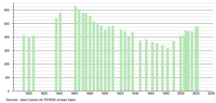 L'évolution du nombre d'habitants est connue à travers les recensements de la population effectués dans la commune depuis 1793. Pour les communes de moins de 10 000 habitants, une enquête de recensement portant sur toute la population est réalisée tous les cinq ans, les populations légales des années intermédiaires étant quant à elles estimées par interpolation ou extrapolation[20]. Pour la commune, le premier recensement exhaustif entrant dans le cadre du nouveau dispositif a été réalisé en 2004[21].