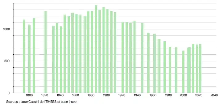 L'évolution du nombre d'habitants est connue à travers les recensements de la population effectués dans la commune depuis 1793. Pour les communes de moins de 10 000 habitants, une enquête de recensement portant sur toute la population est réalisée tous les cinq ans, les populations légales des années intermédiaires étant quant à elles estimées par interpolation ou extrapolation[18]. Pour la commune, le premier recensement exhaustif entrant dans le cadre du nouveau dispositif a été réalisé en 2007[19].
