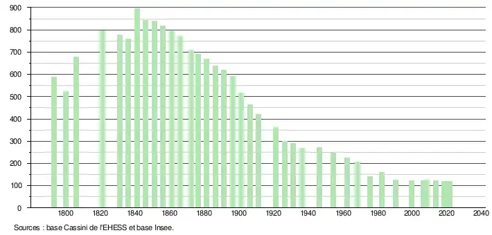 L'évolution du nombre d'habitants est connue à travers les recensements de la population effectués dans la commune depuis 1793. Pour les communes de moins de 10 000 habitants, une enquête de recensement portant sur toute la population est réalisée tous les cinq ans, les populations légales des années intermédiaires étant quant à elles estimées par interpolation ou extrapolation[16]. Pour la commune, le premier recensement exhaustif entrant dans le cadre du nouveau dispositif a été réalisé en 2008[17].