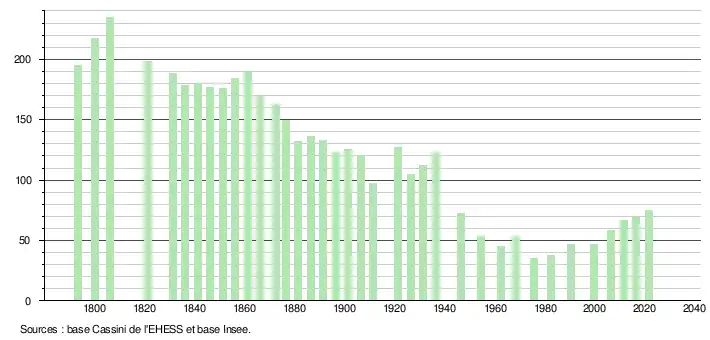 L'évolution du nombre d'habitants est connue à travers les recensements de la population effectués dans la commune depuis 1793. Pour les communes de moins de 10 000 habitants, une enquête de recensement portant sur toute la population est réalisée tous les cinq ans, les populations légales des années intermédiaires étant quant à elles estimées par interpolation ou extrapolation[19]. Pour la commune, le premier recensement exhaustif entrant dans le cadre du nouveau dispositif a été réalisé en 2006[20].