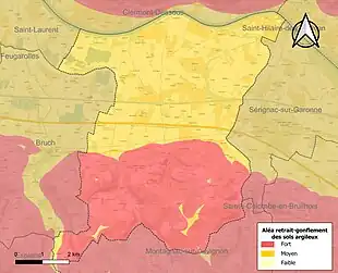 Le retrait-gonflement des sols argileux est susceptible d'engendrer des dommages importants aux bâtiments en cas d’alternance de périodes de sécheresse et de pluie[20]. La totalité de la commune est en aléa moyen ou fort (91,8 % au niveau départemental et 48,5 % au niveau national)[Carte 2]. Depuis le , en application de la loi ELAN, différentes contraintes s'imposent aux vendeurs, maîtres d'ouvrages ou constructeurs de biens situés dans une zone classée en aléa moyen ou fort[Note 4],[21].