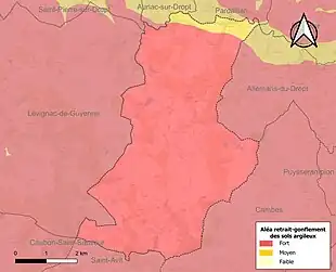 Le retrait-gonflement des sols argileux est susceptible d'engendrer des dommages importants aux bâtiments en cas d’alternance de périodes de sécheresse et de pluie[19]. La totalité de la commune est en aléa moyen ou fort (91,8 % au niveau départemental et 48,5 % au niveau national)[Carte 2]. Depuis le , en application de la loi ELAN, différentes contraintes s'imposent aux vendeurs, maîtres d'ouvrages ou constructeurs de biens situés dans une zone classée en aléa moyen ou fort[Note 2],[20].