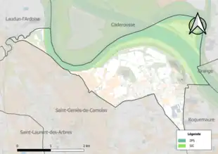 L'occupation des sols de la commune, telle qu'elle ressort de la base de données européenne d’occupation biophysique des sols Corine Land Cover (CLC), est marquée par l'importance des territoires agricoles (46,4 % en 2018), en augmentation par rapport à 1990 (44,1 %). La répartition détaillée en 2018 est la suivante : zones agricoles hétérogènes (27,8 %), eaux continentales[Note 6] (21,2 %), cultures permanentes (18 %), zones urbanisées (17,9 %), forêts (8,1 %), milieux à végétation arbustive et/ou herbacée (6,4 %), prairies (0,6 %)[16]. L'évolution de l’occupation des sols de la commune et de ses infrastructures peut être observée sur les différentes représentations cartographiques du territoire : la carte de Cassini (XVIIIe siècle), la carte d'état-major (1820-1866) et les cartes ou photos aériennes de l'IGN pour la période actuelle (1950 à aujourd'hui)[Carte 1].