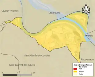 Le retrait-gonflement des sols argileux est susceptible d'engendrer des dommages importants aux bâtiments en cas d’alternance de périodes de sécheresse et de pluie. 95,1 % de la superficie communale est en aléa moyen ou fort (67,5 % au niveau départemental et 48,5 % au niveau national). Sur les 595 bâtiments dénombrés sur la commune en 2019, 595 sont en aléa moyen ou fort, soit 100 %, à comparer aux 90 % au niveau départemental et 54 % au niveau national. Une cartographie de l'exposition du territoire national au retrait gonflement des sols argileux est disponible sur le site du BRGM[23],[Carte 2].