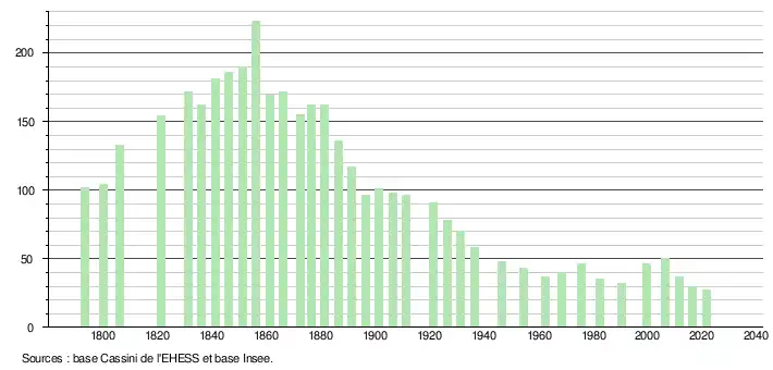 L'évolution du nombre d'habitants est connue à travers les recensements de la population effectués dans la commune depuis 1793. Pour les communes de moins de 10 000 habitants, une enquête de recensement portant sur toute la population est réalisée tous les cinq ans, les populations légales des années intermédiaires étant quant à elles estimées par interpolation ou extrapolation[17]. Pour la commune, le premier recensement exhaustif entrant dans le cadre du nouveau dispositif a été réalisé en 2006[18].