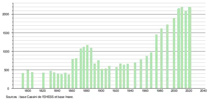 L'évolution du nombre d'habitants est connue à travers les recensements de la population effectués dans la commune depuis 1793. Pour les communes de moins de 10 000 habitants, une enquête de recensement portant sur toute la population est réalisée tous les cinq ans, les populations légales des années intermédiaires étant quant à elles estimées par interpolation ou extrapolation[22]. Pour la commune, le premier recensement exhaustif entrant dans le cadre du nouveau dispositif a été réalisé en 2005[23].