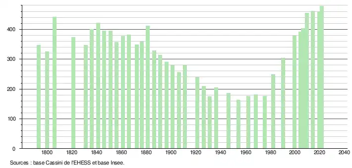L'évolution du nombre d'habitants est connue à travers les recensements de la population effectués dans la commune depuis 1793. Pour les communes de moins de 10 000 habitants, une enquête de recensement portant sur toute la population est réalisée tous les cinq ans, les populations légales des années intermédiaires étant quant à elles estimées par interpolation ou extrapolation[32]. Pour la commune, le premier recensement exhaustif entrant dans le cadre du nouveau dispositif a été réalisé en 2004[33].