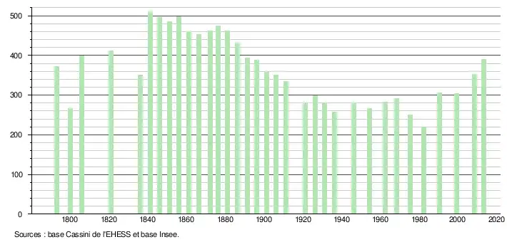 - Dans le tableau des recensements et le graphique, par convention dans Wikipédia, le principe a été retenu, pour les populations légales postérieures à 1999 de n’afficher dans le tableau des recensements et le graphique que les populations correspondant à l'année 2006, première population légale publiée calculée conformément aux concepts définis dans le décret no 2003-485 du 5 juin 2003, et les années correspondant à une enquête exhaustive de recensement pour les communes de moins de 10 000 habitants, ainsi que la dernière population légale publiée par l’Insee.