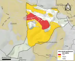 Les mouvements de terrains susceptibles de se produire sur la commune sont soit des chutes de blocs, soit des glissements de terrains, soit des effondrements liés à des cavités souterraines, soit des mouvements liés au retrait-gonflement des argiles. Près de 50 % de la superficie du département est concernée par l'aléa retrait-gonflement des argiles, dont la commune de Montgauch[35]. L'inventaire national des cavités souterraines permet par ailleurs de localiser celles situées sur la commune[36].