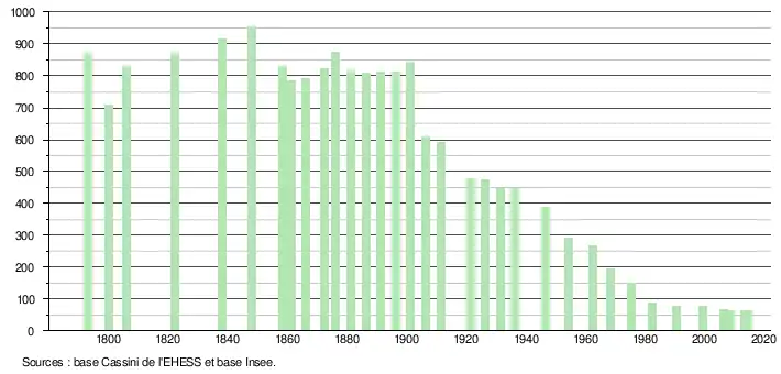L'évolution du nombre d'habitants est connue à travers les recensements de la population effectués dans la commune depuis 1793. Pour les communes de moins de 10 000 habitants, une enquête de recensement portant sur toute la population est réalisée tous les cinq ans, les populations légales des années intermédiaires étant quant à elles estimées par interpolation ou extrapolation[3]. Pour la commune, le premier recensement exhaustif entrant dans le cadre du nouveau dispositif a été réalisé en 2008[4].