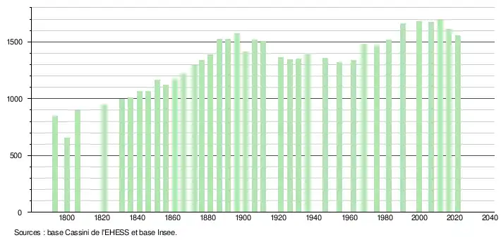L'évolution du nombre d'habitants est connue à travers les recensements de la population effectués dans la commune depuis 1793. Pour les communes de moins de 10 000 habitants, une enquête de recensement portant sur toute la population est réalisée tous les cinq ans, les populations légales des années intermédiaires étant quant à elles estimées par interpolation ou extrapolation[44]. Pour la commune, le premier recensement exhaustif entrant dans le cadre du nouveau dispositif a été réalisé en 2006[45].