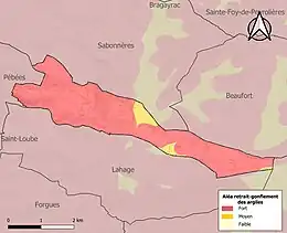 Le retrait-gonflement des sols argileux est susceptible d'engendrer des dommages importants aux bâtiments en cas d’alternance de périodes de sécheresse et de pluie. La totalité de la commune est en aléa moyen ou fort (88,8 % au niveau départemental et 48,5 % au niveau national). Sur les 43 bâtiments dénombrés sur la commune en 2019, 43 sont en aléa moyen ou fort, soit 100 %, à comparer aux 98 % au niveau départemental et 54 % au niveau national. Une cartographie de l'exposition du territoire national au retrait gonflement des sols argileux est disponible sur le site du BRGM[27],[Carte 3].