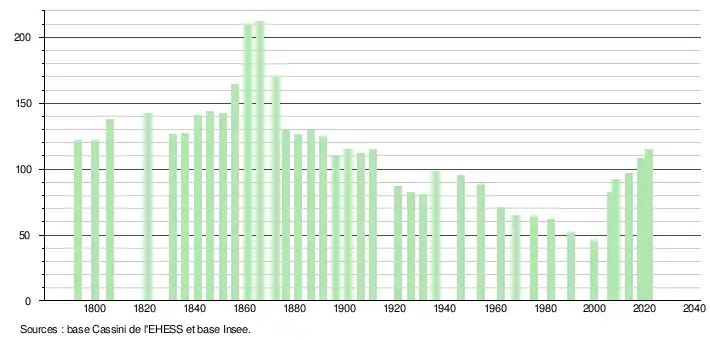 | L'évolution du nombre d'habitants est connue à travers les recensements de la population effectués dans la commune depuis 1793. Pour les communes de moins de 10 000 habitants, une enquête de recensement portant sur toute la population est réalisée tous les cinq ans, les populations légales des années intermédiaires étant quant à elles estimées par interpolation ou extrapolation[31]. Pour la commune, le premier recensement exhaustif entrant dans le cadre du nouveau dispositif a été réalisé en 2008[32]. En 2021, la commune comptait 115 habitants[Note 5], en augmentation de 12,75 % par rapport à 2015 (Haute-Garonne : +7,43 %, France hors Mayotte : +1,84 %). |