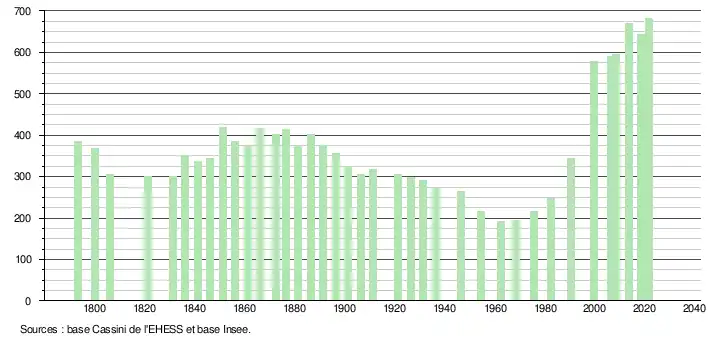 L'évolution du nombre d'habitants est connue à travers les recensements de la population effectués dans la commune depuis 1793. Pour les communes de moins de 10 000 habitants, une enquête de recensement portant sur toute la population est réalisée tous les cinq ans, les populations légales des années intermédiaires étant quant à elles estimées par interpolation ou extrapolation[17]. Pour la commune, le premier recensement exhaustif entrant dans le cadre du nouveau dispositif a été réalisé en 2008[18].