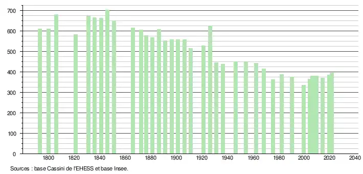 L'évolution du nombre d'habitants est connue à travers les recensements de la population effectués dans la commune depuis 1793. Pour les communes de moins de 10 000 habitants, une enquête de recensement portant sur toute la population est réalisée tous les cinq ans, les populations légales des années intermédiaires étant quant à elles estimées par interpolation ou extrapolation[20]. Pour la commune, le premier recensement exhaustif entrant dans le cadre du nouveau dispositif a été réalisé en 2004[21].