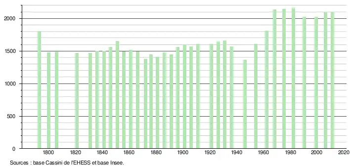 L'évolution du nombre d'habitants est connue à travers les recensements de la population effectués dans la commune depuis 1793. À partir du , les populations légales des communes sont publiées annuellement dans le cadre d'un recensement qui repose désormais sur une collecte d'information annuelle, concernant successivement tous les territoires communaux au cours d'une période de cinq ans. Pour les communes de moins de 10 000 habitants, une enquête de recensement portant sur toute la population est réalisée tous les cinq ans, les populations légales des années intermédiaires étant quant à elles estimées par interpolation ou extrapolation[6]. Pour la commune, le premier recensement exhaustif entrant dans le cadre du nouveau dispositif a été réalisé en 2006[7],[Note 1].