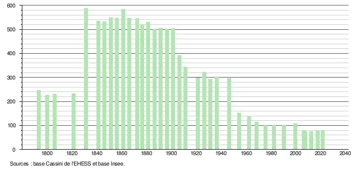 | L'évolution du nombre d'habitants est connue à travers les recensements de la population effectués dans la commune depuis 1793. Pour les communes de moins de 10 000 habitants, une enquête de recensement portant sur toute la population est réalisée tous les cinq ans, les populations légales des années intermédiaires étant quant à elles estimées par interpolation ou extrapolation[26]. Pour la commune, le premier recensement exhaustif entrant dans le cadre du nouveau dispositif a été réalisé en 2007[27]. En 2021, la commune comptait 80 habitants[Note 5], en augmentation de 5,26 % par rapport à 2015 (Gers : +0,79 %, France hors Mayotte : +1,84 %). |