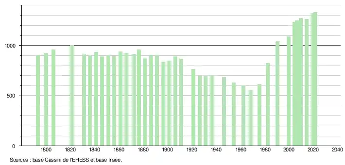 L'évolution du nombre d'habitants est connue à travers les recensements de la population effectués dans la commune depuis 1793. Pour les communes de moins de 10 000 habitants, une enquête de recensement portant sur toute la population est réalisée tous les cinq ans, les populations légales des années intermédiaires étant quant à elles estimées par interpolation ou extrapolation[22]. Pour la commune, le premier recensement exhaustif entrant dans le cadre du nouveau dispositif a été réalisé en 2004[23].
