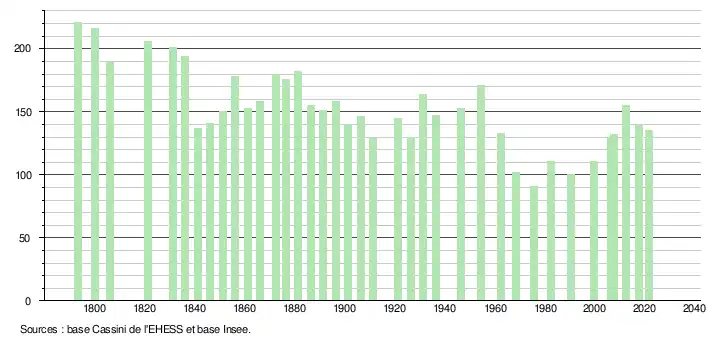 | L'évolution du nombre d'habitants est connue à travers les recensements de la population effectués dans la commune depuis 1793. Pour les communes de moins de 10 000 habitants, une enquête de recensement portant sur toute la population est réalisée tous les cinq ans, les populations légales des années intermédiaires étant quant à elles estimées par interpolation ou extrapolation[18]. Pour la commune, le premier recensement exhaustif entrant dans le cadre du nouveau dispositif a été réalisé en 2007[19]. En 2021, la commune comptait 135 habitants[Note 2], en diminution de 12,34 % par rapport à 2015 (Gironde : +6,88 %, France hors Mayotte : +1,84 %). |