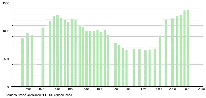 L'évolution du nombre d'habitants est connue à travers les recensements de la population effectués dans la commune depuis 1793. Pour les communes de moins de 10 000 habitants, une enquête de recensement portant sur toute la population est réalisée tous les cinq ans, les populations légales des années intermédiaires étant quant à elles estimées par interpolation ou extrapolation[54]. Pour la commune, le premier recensement exhaustif entrant dans le cadre du nouveau dispositif a été réalisé en 2006[55].