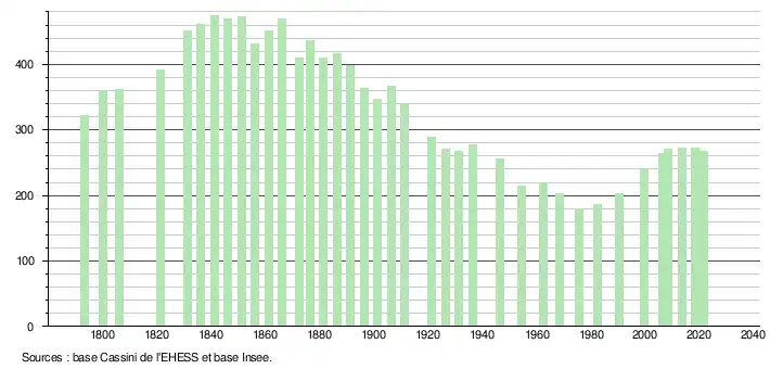 L'évolution du nombre d'habitants est connue à travers les recensements de la population effectués dans la commune depuis 1793. Pour les communes de moins de 10 000 habitants, une enquête de recensement portant sur toute la population est réalisée tous les cinq ans, les populations légales des années intermédiaires étant quant à elles estimées par interpolation ou extrapolation[18]. Pour la commune, le premier recensement exhaustif entrant dans le cadre du nouveau dispositif a été réalisé en 2008[19].