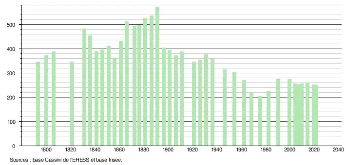 L'évolution du nombre d'habitants est connue à travers les recensements de la population effectués dans la commune depuis 1793. Pour les communes de moins de 10 000 habitants, une enquête de recensement portant sur toute la population est réalisée tous les cinq ans, les populations légales des années intermédiaires étant quant à elles estimées par interpolation ou extrapolation[21]. Pour la commune, le premier recensement exhaustif entrant dans le cadre du nouveau dispositif a été réalisé en 2004[22].