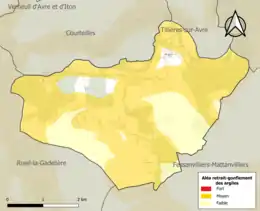 Le retrait-gonflement des sols argileux est susceptible d'engendrer des dommages importants aux bâtiments en cas d’alternance de périodes de sécheresse et de pluie. 72,6 % de la superficie communale est en aléa moyen ou fort (52,8 % au niveau départemental et 48,5 % au niveau national). Sur les 162 bâtiments dénombrés sur la commune en 2019, 96 sont en aléa moyen ou fort, soit 59 %, à comparer aux 70 % au niveau départemental et 54 % au niveau national. Une cartographie de l'exposition du territoire national au retrait gonflement des sols argileux est disponible sur le site du BRGM[18],[Carte 2].