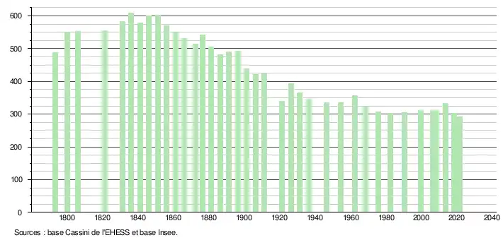 L'évolution du nombre d'habitants est connue à travers les recensements de la population effectués dans la commune depuis 1793. Pour les communes de moins de 10 000 habitants, une enquête de recensement portant sur toute la population est réalisée tous les cinq ans, les populations légales des années intermédiaires étant quant à elles estimées par interpolation ou extrapolation[21]. Pour la commune, le premier recensement exhaustif entrant dans le cadre du nouveau dispositif a été réalisé en 2008[22].
