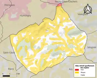 La commune est vulnérable au risque de mouvements de terrains constitué principalement du retrait-gonflement des sols argileux[15]. Cet aléa est susceptible d'engendrer des dommages importants aux bâtiments en cas d’alternance de périodes de sécheresse et de pluie. 59,8 % de la superficie communale est en aléa moyen ou fort (90 % au niveau départemental et 48,5 % au niveau national). Sur les 287 bâtiments dénombrés sur la commune en 2019, 203 sont en aléa moyen ou fort, soit 71 %, à comparer aux 83 % au niveau départemental et 54 % au niveau national. Une cartographie de l'exposition du territoire national au retrait gonflement des sols argileux est disponible sur le site du BRGM[16],[Carte 2].