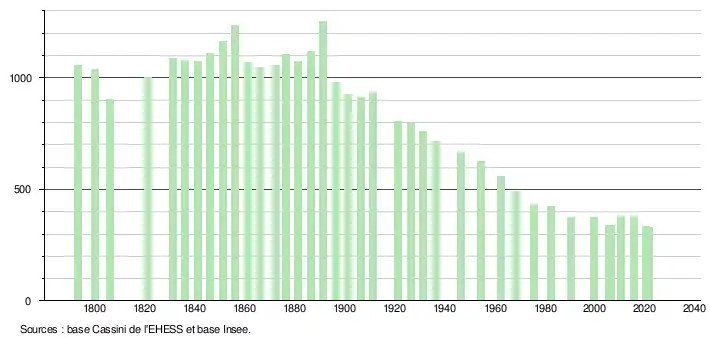 L'évolution du nombre d'habitants est connue à travers les recensements de la population effectués dans la commune depuis 1793. Pour les communes de moins de 10 000 habitants, une enquête de recensement portant sur toute la population est réalisée tous les cinq ans, les populations légales des années intermédiaires étant quant à elles estimées par interpolation ou extrapolation[24]. Pour la commune, le premier recensement exhaustif entrant dans le cadre du nouveau dispositif a été réalisé en 2005[25].