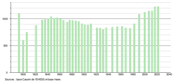 L'évolution du nombre d'habitants est connue à travers les recensements de la population effectués dans la commune depuis 1793. Pour les communes de moins de 10 000 habitants, une enquête de recensement portant sur toute la population est réalisée tous les cinq ans, les populations légales des années intermédiaires étant quant à elles estimées par interpolation ou extrapolation[39]. Pour la commune, le premier recensement exhaustif entrant dans le cadre du nouveau dispositif a été réalisé en 2006[40].