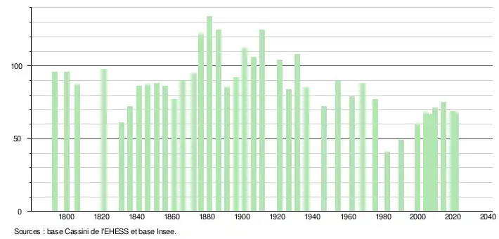 | L'évolution du nombre d'habitants est connue à travers les recensements de la population effectués dans la commune depuis 1793. Pour les communes de moins de 10 000 habitants, une enquête de recensement portant sur toute la population est réalisée tous les cinq ans, les populations légales des années intermédiaires étant quant à elles estimées par interpolation ou extrapolation[23]. Pour la commune, le premier recensement exhaustif entrant dans le cadre du nouveau dispositif a été réalisé en 2004[24]. En 2021, la commune comptait 68 habitants[Note 6], en diminution de 10,53 % par rapport à 2015 (Aude : +2,47 %, France hors Mayotte : +1,84 %). |