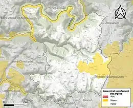 La commune est vulnérable au risque de mouvements de terrains constitué principalement du retrait-gonflement des sols argileux[27]. Cet aléa est susceptible d'engendrer des dommages importants aux bâtiments en cas d’alternance de périodes de sécheresse et de pluie. 14,5 % de la superficie communale est en aléa moyen ou fort (76,3 % au niveau départemental et 48,5 % au niveau national). Sur les 269 bâtiments dénombrés sur la commune en 2019, 54 sont en aléa moyen ou fort, soit 20 %, à comparer aux 90 % au niveau départemental et 54 % au niveau national. Une cartographie de l'exposition du territoire national au retrait gonflement des sols argileux est disponible sur le site du BRGM[28],[Carte 3].