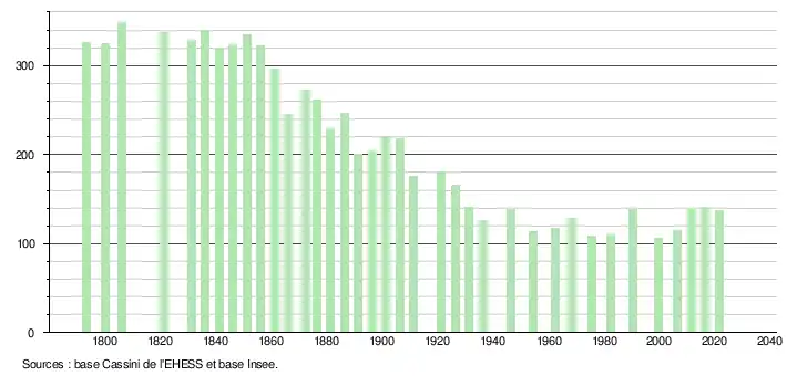 L'évolution du nombre d'habitants est connue à travers les recensements de la population effectués dans la commune depuis 1793. Pour les communes de moins de 10 000 habitants, une enquête de recensement portant sur toute la population est réalisée tous les cinq ans, les populations légales des années intermédiaires étant quant à elles estimées par interpolation ou extrapolation[26]. Pour la commune, le premier recensement exhaustif entrant dans le cadre du nouveau dispositif a été réalisé en 2006[27].