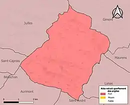 Le retrait-gonflement des sols argileux est susceptible d'engendrer des dommages importants aux bâtiments en cas d’alternance de périodes de sécheresse et de pluie. La totalité de la commune est en aléa moyen ou fort (94,5 % au niveau départemental et 48,5 % au niveau national). Sur les 72 bâtiments dénombrés sur la commune en 2019, 72 sont en aléa moyen ou fort, soit 100 %, à comparer aux 93 % au niveau départemental et 54 % au niveau national. Une cartographie de l'exposition du territoire national au retrait gonflement des sols argileux est disponible sur le site du BRGM[24],[Carte 3].
