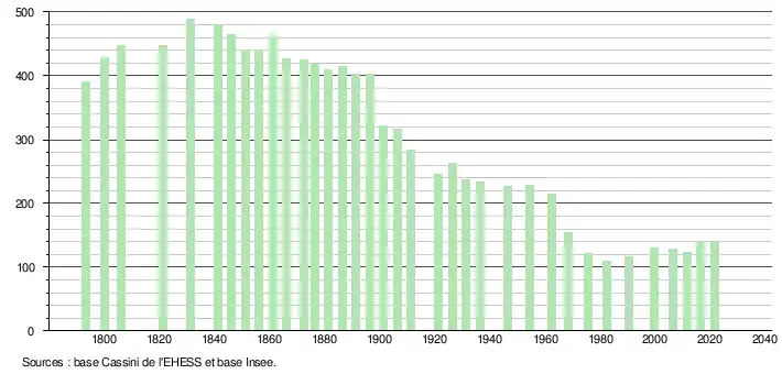 | L'évolution du nombre d'habitants est connue à travers les recensements de la population effectués dans la commune depuis 1793. Pour les communes de moins de 10 000 habitants, une enquête de recensement portant sur toute la population est réalisée tous les cinq ans, les populations légales des années intermédiaires étant quant à elles estimées par interpolation ou extrapolation[32]. Pour la commune, le premier recensement exhaustif entrant dans le cadre du nouveau dispositif a été réalisé en 2006[33]. En 2021, la commune comptait 140 habitants[Note 6], en augmentation de 4,48 % par rapport à 2015 (Gers : +0,79 %, France hors Mayotte : +1,84 %). |