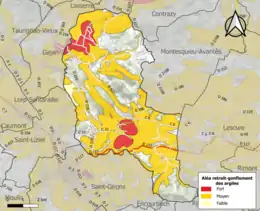 Les mouvements de terrains susceptibles de se produire sur la commune sont soit des chutes de blocs, soit des glissements de terrains, soit des effondrements liés à des cavités souterraines, soit des mouvements liés au retrait-gonflement des argiles. Près de 50 % de la superficie du département est concernée par l'aléa retrait-gonflement des argiles, dont la commune de Montjoie-en-Couserans[44]. L'inventaire national des cavités souterraines permet par ailleurs de localiser celles situées sur la commune[45].